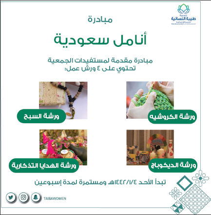 تسعى جمعية طيبة النسائية للتنمية الاجتماعية لتوفير فرص اقتصادية مستدامة لمستفيدات الجمعية والاسر المنتجة عبر تطوير قدراتهن كمُعيلات مستقلات داخل أسرهن بتوفير فرص تدريب وتأهيل واحتضان لمشاريعهن، وذلك من خلال البرامج والمبادرات المتنوعة المقدمة في الجمعية في إدارة البرامج وحاضنة الأعمال والتي تشمل الحرف اليدوية وفنون الطهي، إضافة إلى تطوير مهارات سوق العمل والريادة وإدارة الأعمال لديهن. وضمن دورها التنموي وتماشيا مع موافقة المقام السامي على مقترح ولي العهد صاحب السمو الملكي الأمير محمد بن سلمان بن عبد العزيز حفظة الله تقدم جمعية طيبة النسائية للتنمية الاجتماعية برنامج : أنامل سعودية.